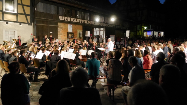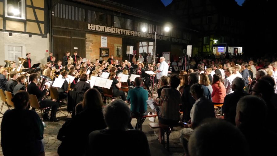 Ab 21:30 Uhr spielt das große Blasorchester vor der malerischen Kulisse der Diefenbacher Kelter ein festliches Nachtkonzert – ein