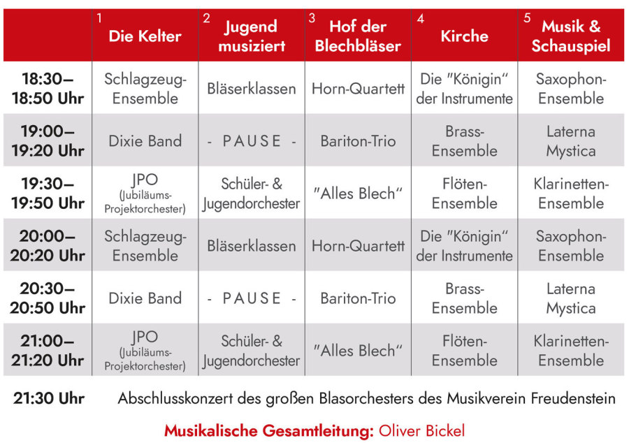Musikalisch ist für jeden Geschmack etwas dabei: Von traditioneller Blasmusik über jazzige Klänge und konzertante Werke bis hin zu Gesang und Literatur. Junge Talente und erfahrene Musiker*innen teilen sich die Bühne – und sorgen gemeinsam für ein unvergessliches Hörerlebnis.